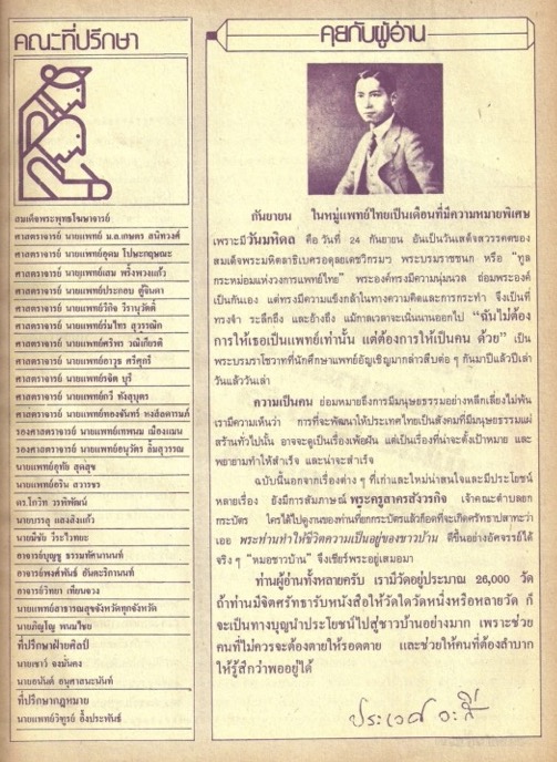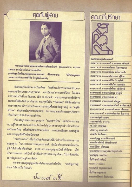 เนื้อหาในเอกสารปรากฏรายชื่อของคณะที่ปรึกษาของนิตยสาร และกล่าวถึงความสำคัญของวันมหิดล ซึ่งเป็นวันที่สมเด็จพระมหิตลาธิเบศร อดุลยเดชวิกรม พระบรมราชชนก พระบิดาแห่งการแพทย์ไทย ได้เสด็จสวรรคตในวันที่ 24 กันยายน คณะแพทยศาสตร์ศิริราชพยาบาลจัดกิจกรรมเพื่อระลึกถึงพระองค์ท่าน ผู้เขียนอธิบายถึงบทบาทของนิตยสารหมอชาวบ้านที่เจริญรอยตามพระยุคลบาทในการส่งเสริมสุขภาพด้วยการสาธารณสุขมูลฐาน -