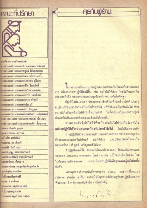เนื้อหาในเอกสารปรากฏรายชื่อของคณะที่ปรึกษาของนิตยสาร ผู้เขียนกล่าวถึงการป้องกันโรคหัวใจด้วยการออกกำลังกาย การรับประทานอาหารที่เหมาะสม และการบริหารจิต โดยกล่าวถึงหลักการของพระพุทธศาสนาเรื่องการกระทำ และการพึ่งตนเอง และเปรียบเทียบกับการดูแลสุขภาพว่าขึ้นอยู่กับการปฏิบัติละการพึ่งตนเอง -