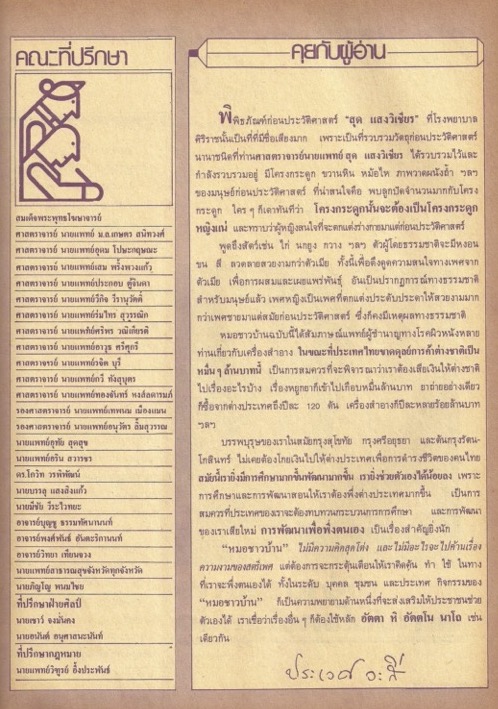 เนื้อหาในเอกสารปรากฏรายชื่อของคณะที่ปรึกษาของนิตยสาร ผู้เขียนกล่าวระลึกถึงสมเด็จพระมหิตลาธิเบศรอดุลยเดชวิกรมฯ พระบรมราชชนก ในวันมหิดล วันที่ 24 กันยายน ซึ่งเป็นวันเสด็จสวรรคตของ "ทูลกระหม่อมแห่งวงการแพทย์ไทย" โดยกล่าวถึงพระบรมราโชวาทที่ว่า "ฉันไม่ต้องการให้เธอเป็นแพทย์เท่านั้น แต่ต้องการให้เป็นคนด้วย" นอกจากนี้ ยังกล่าวถึงความสำคัญของมนุษยธรรมที่มีผลต่อการพัฒนาประเทศ ผู้เขียนกล่าวถึงบทสัมภาษณ์ เรื่อง บทบาทของสงฆ์ต่อการพัฒนาชุมชน ของพระครูสาครสังวรกิจ เจ้าคณะตำบลยกกระบัตร ช่วงท้าย ผู้เขียนเชิญชวนให้ผู้อ่านร่วมบริจาคหนังสือให้วัดเพื่อเผยแพร่องค์ความรู้สู่ชุมชน -