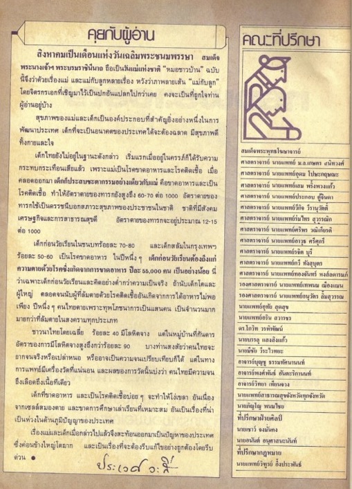 เนื้อหาในเอกสารปรากฏรายชื่อของคณะที่ปรึกษาของนิตยสาร และกล่าวถึงสุขภาพของแม่และเด็กเนื่องในวันเฉลิมพระชนมพรรษา สมเด็จพระนางเจ้าฯ พระบรมราชินีนาถ ซึ่งเป็นวันแม่แห่งชาติ ผู้เขียนกล่าวถึงปัญหาสุขภาพของแม่และทารกเรื่องโรคขาดอาหารและโรคติดเชื้อ โดยเฉพาะเด็กก่อนวัยเรียนในชนบทและเด็กสลัมในกรุงเทพฯ นอกจากนี้ยังกล่าวถึงปัญหาโรคโลหิตจางของชาวนาไทย -