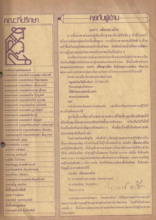 เนื้อหาในเอกสารปรากฏรายชื่อของคณะที่ปรึกษาของนิตยสารและจุดมุ่งหมายในการดำเนินงานของนิตยสาร ผู้เขียนกล่าวถึงความสำคัญของการส่งเสริมความรู้สู่ประชาชนเพื่อพัฒนาให้เกิดสุขภาวะที่ดีในการดำรงชีวิต ผ่านการสนับสนุน "จุลสาร เพื่อนชาวบ้าน" ที่เป็นหนังสือรายเดือนที่มีจุดมุ่งหมายในการถ่ายทอดความรู้และส่งต่อไปยังประชาชน ผู้เขียนเชิญชวนให้ผู้ที่สนใจร่วมสนับสนุน จุลสาร เพื่อนชาวบ้าน พร้อมแจ้งรายละเอียดที่อยู่สำหรับติดต่อ -