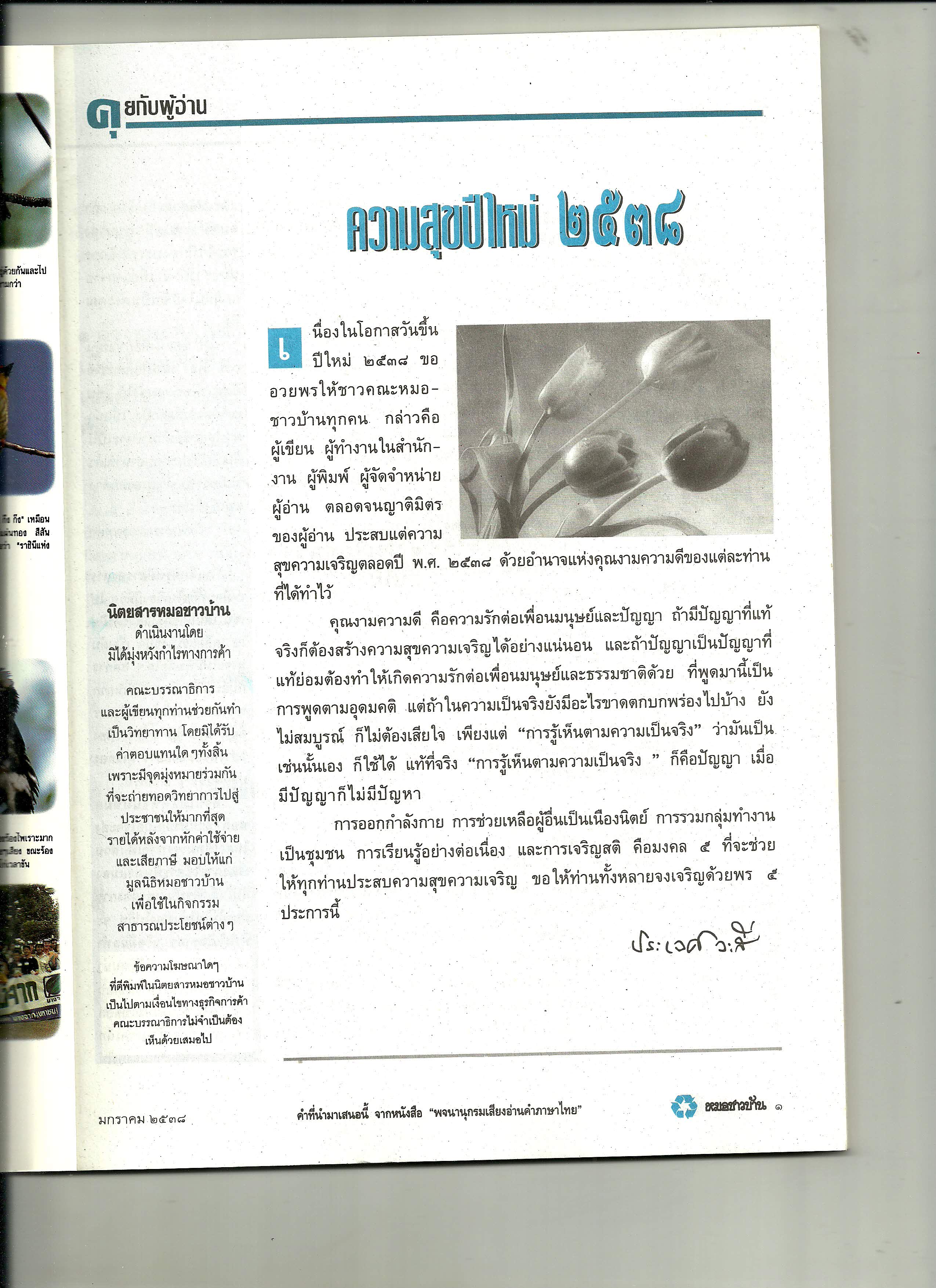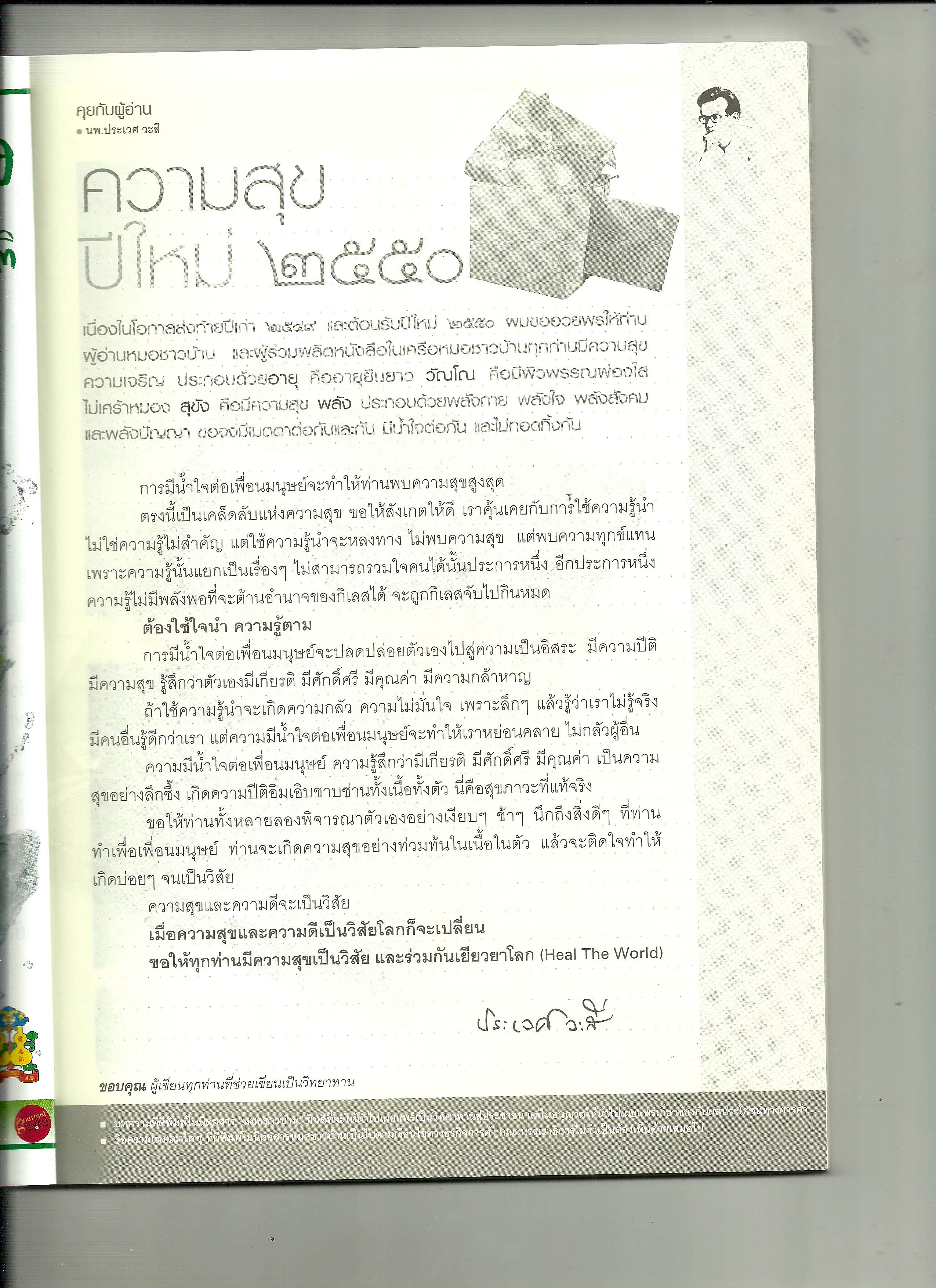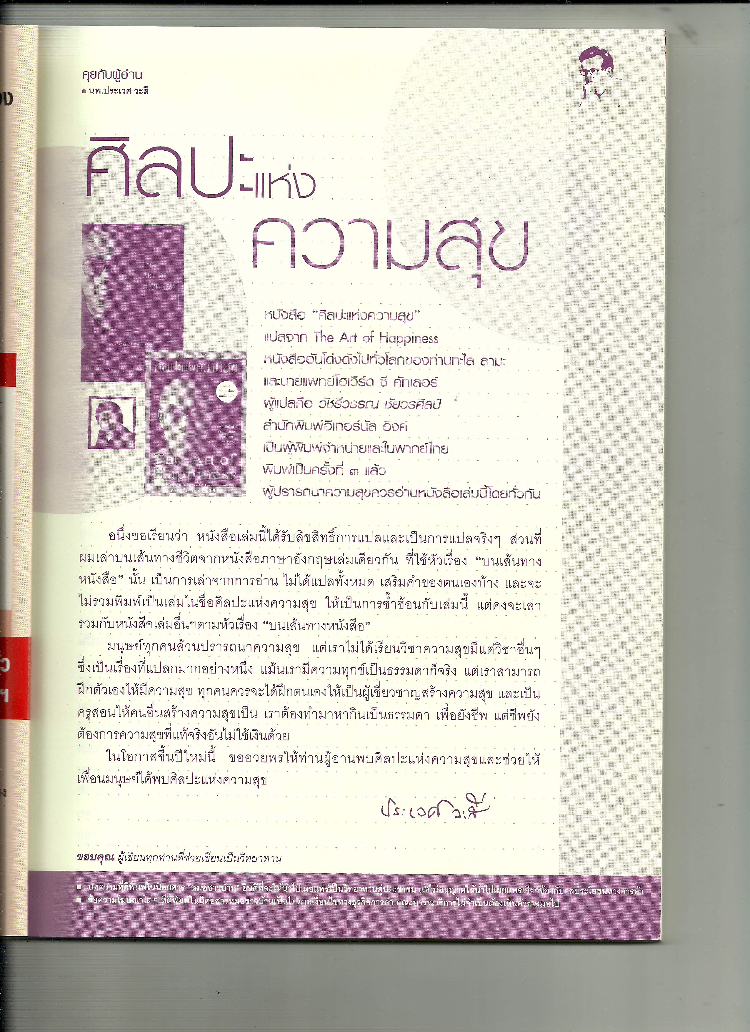 บทบรรณาธิการในนิตยสารหมอชาวบ้าน ฉบับที่ 321 เดือนมกราคม 2549 ซึ่งเขียนโดย ศ.นพ.ประเวศ วะสี ได้แนะนำหนังสือเรื่อง ศิลปะแห่งความสุข และช่วงท้ายได้เขียนอวยพรในโอกาสขึ้นปีใหม่ -