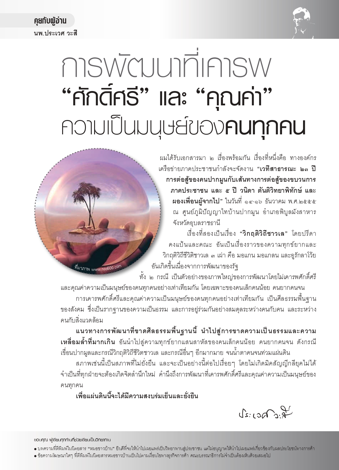 คุยกับผู้อ่าน : การพัฒนาที่เคารพ “ศักดิ์ศรี” และ “คุณค่า” ความเป็นมนุษย์ของคนทุกคน (นิตยสารหมอชาวบ้าน พ.ศ. 2555)