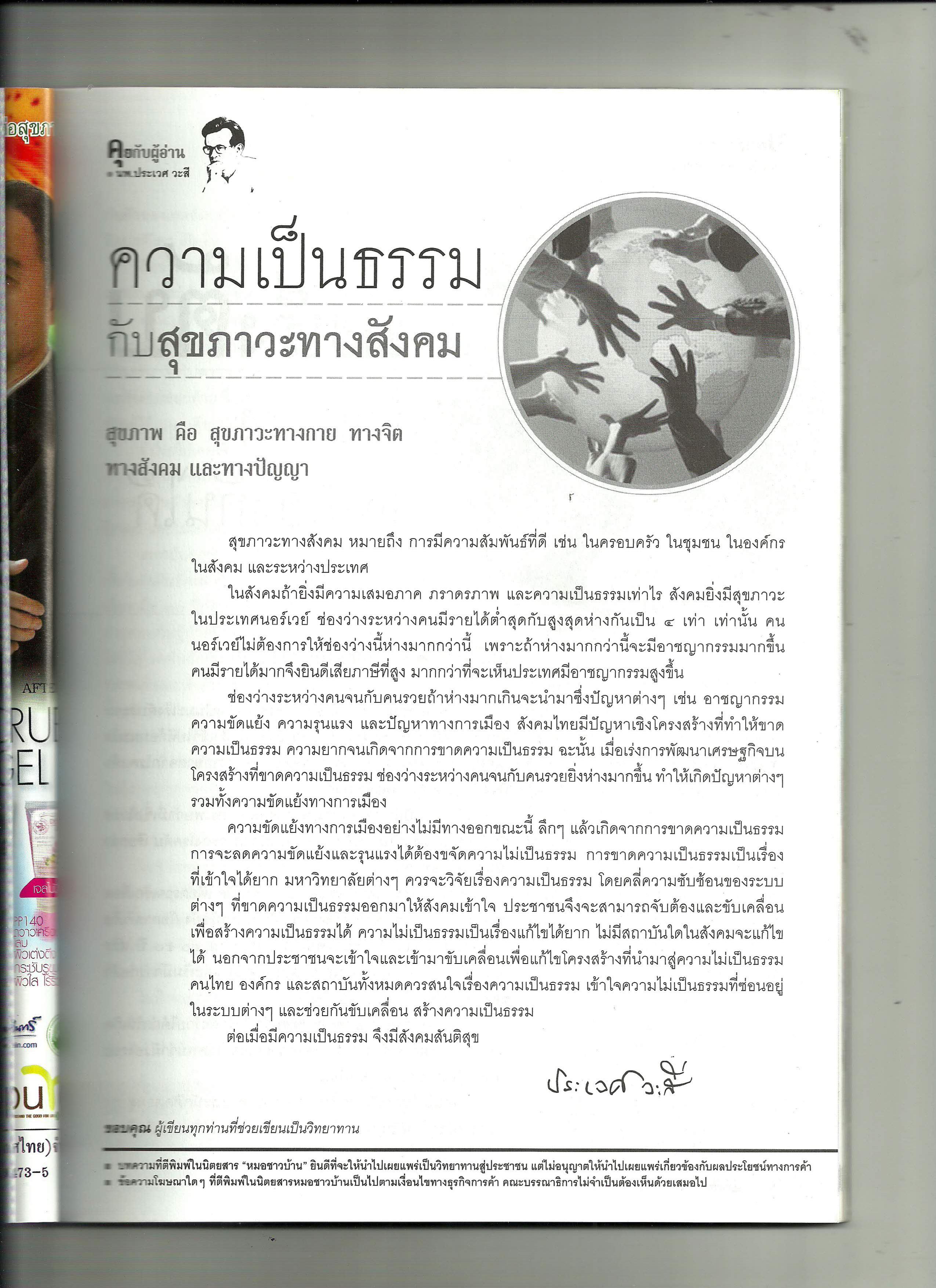 ศ.นพ.ประเวศ วะสี ได้ เขียนบทความ ความเป็นธรรมกับสุขภาวะทางสังคม ในนิตยสาร หมอชาวบ้าน คอลัมน์คุยกับผู้อ่าน โดย ศ.นพ.ประเวศ วะสี โดยได้ให้หลักการด้านสุขภาพ คือสุขภาวะทางกาย ทางจิต ทางสังคมและทางปัญญาไว้อย่างน่าสนใจ
