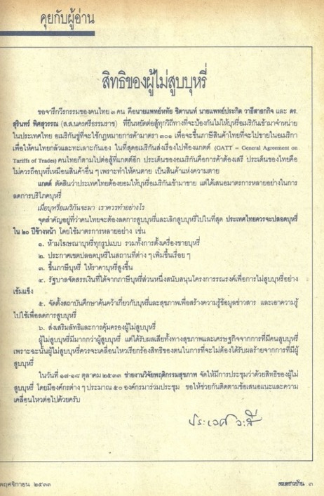 คุยกับผู้อ่าน : สิทธิของผู้ไม่สูบบุหรี่ (นิตยสารหมอชาวบ้าน ฉบับที่ 139 เดือนพฤศจิกายน พ.ศ. 2533)