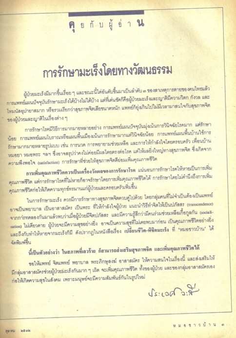 คุยกับผู้อ่าน : การรักษามะเร็งโดยทางวัฒนธรรม (นิตยสารหมอชาวบ้าน ฉบับที่ 126 เดือนตุลาคม พ.ศ. 2532)