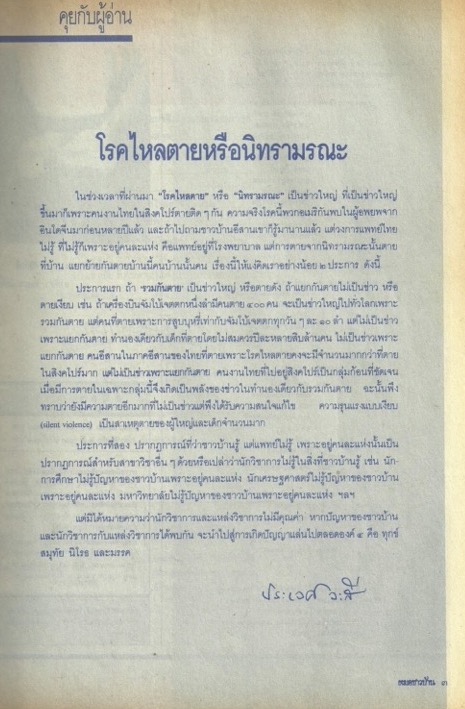 คุยกับผู้อ่าน : โรคไหลตายหรือนิทรามรณะ (นิตยสารหมอชาวบ้าน ฉบับที่ 133 เดือนพฤษภาคม พ.ศ. 2533)