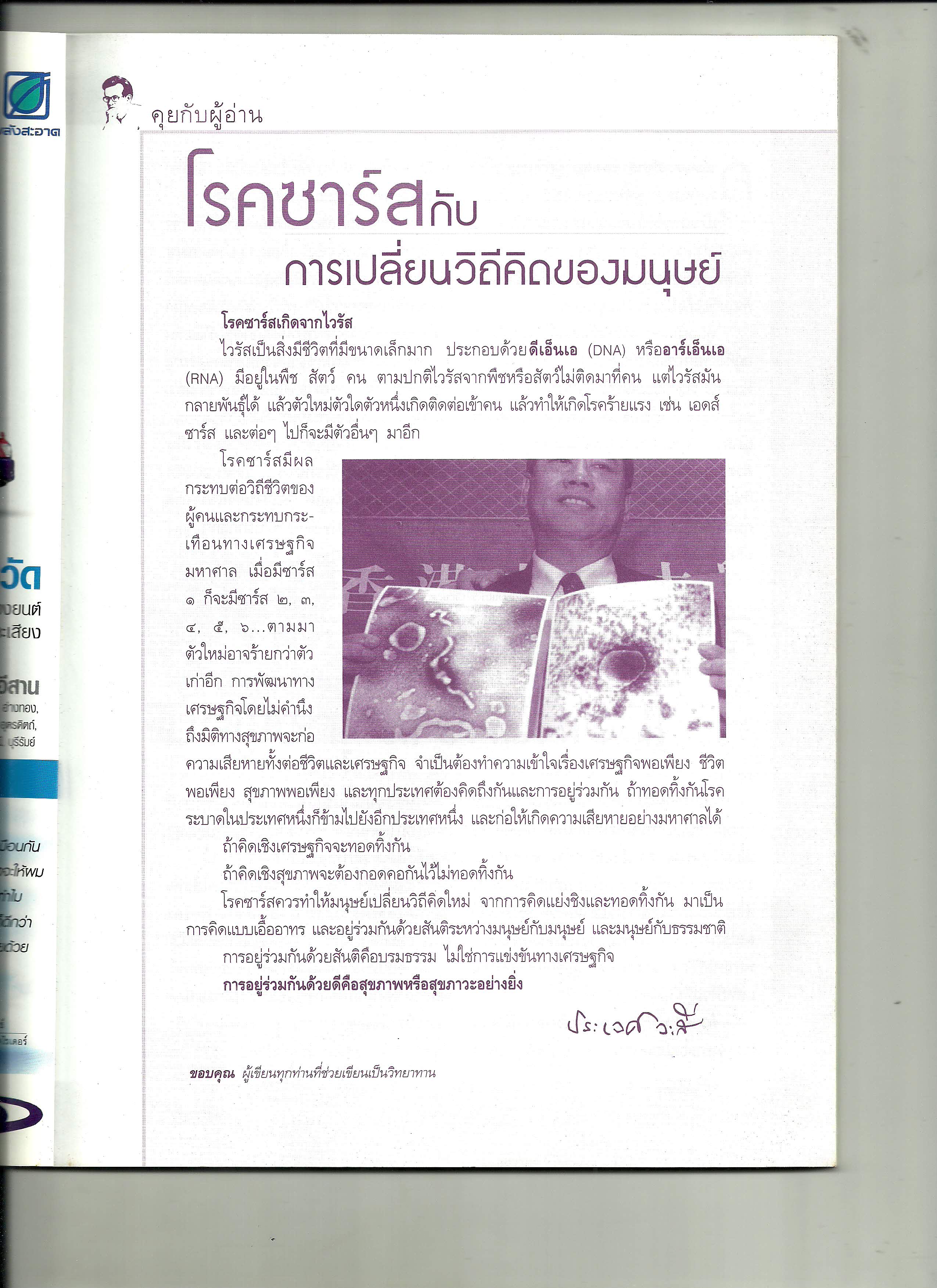 คุยกับผู้อ่าน : โรคซาร์สกับการเปลี่ยนวิถีคิดของมนุษย์ (นิตยสารหมอชาวบ้าน ฉบับที่ 290 เดือนมิถุนายน พ.ศ. 2546)