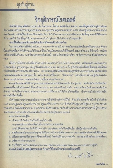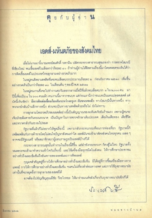 คุยกับผู้อ่าน : เอดส์ - มหันตภัยของสังคมไทย (นิตยสารหมอชาวบ้าน ฉบับที่ 124 เดือนสิงหาคม พ.ศ. 2532)