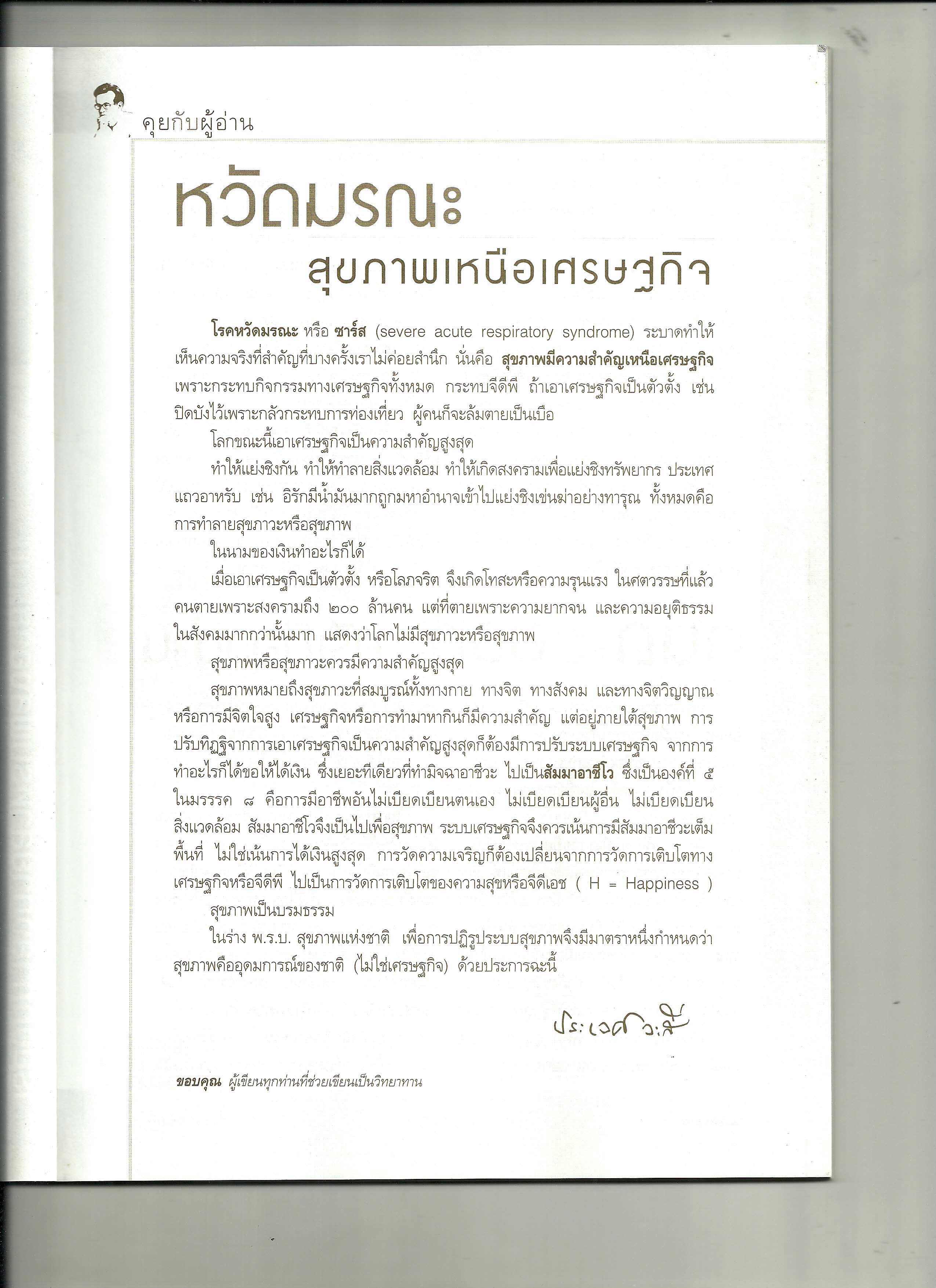 คุยกับผู้อ่าน : หวัดมรณะ สุขภาพเหนือเศรษฐกิจ (นิตยสารหมอชาวบ้าน ฉบับที่ 289 เดือนพฤษภาคม พ.ศ. 2546)