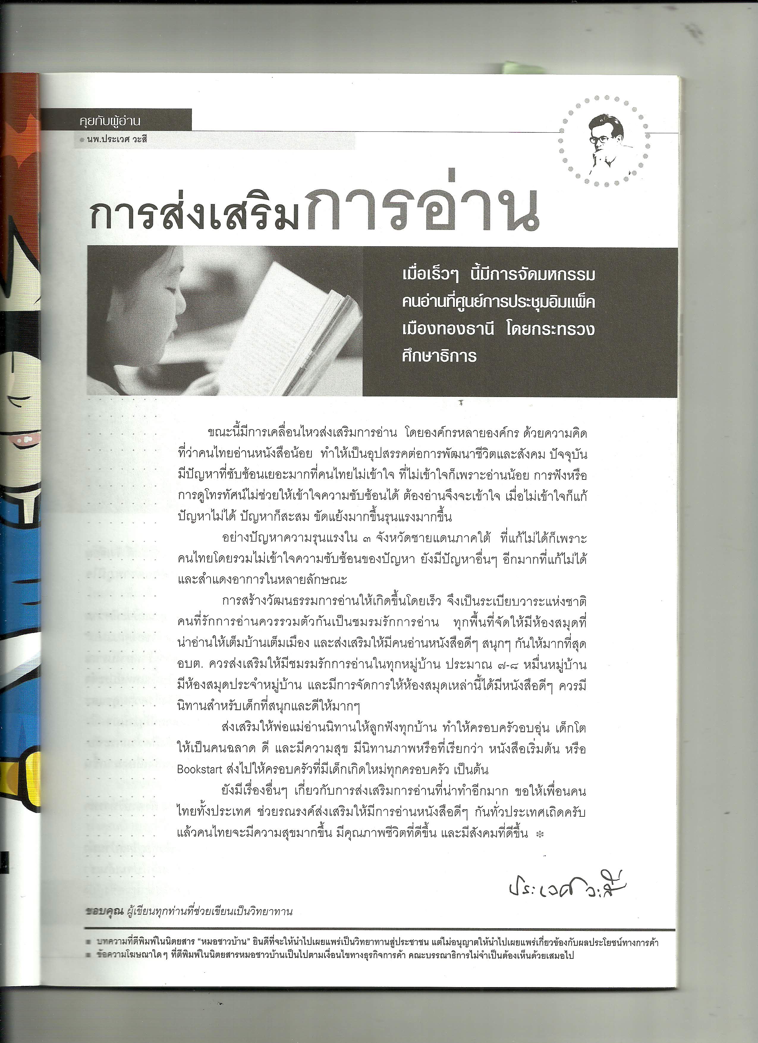 คุยกับผู้อ่านฉบับนี้ ผู้เขียนกล่าวถึงการจัดมหกรรมคนอ่าน ณ ศูนย์การประชุมอิมแพ็คเมืองทองธานี โดยกระทรวงศึกษาธิการ นอกจากนี้ยังได้กล่าวถึงการสร้างวัฒนธรรมการอ่านให้เป็นระเบียบวาระแห่งชาติและส่งเสริมการอ่านเพื่อให้คนไทยมีความสุข มีคุณภาพชีวิตที่ดีขึ้น และมีสังคมที่ดีขึ้นตามมาด้วย