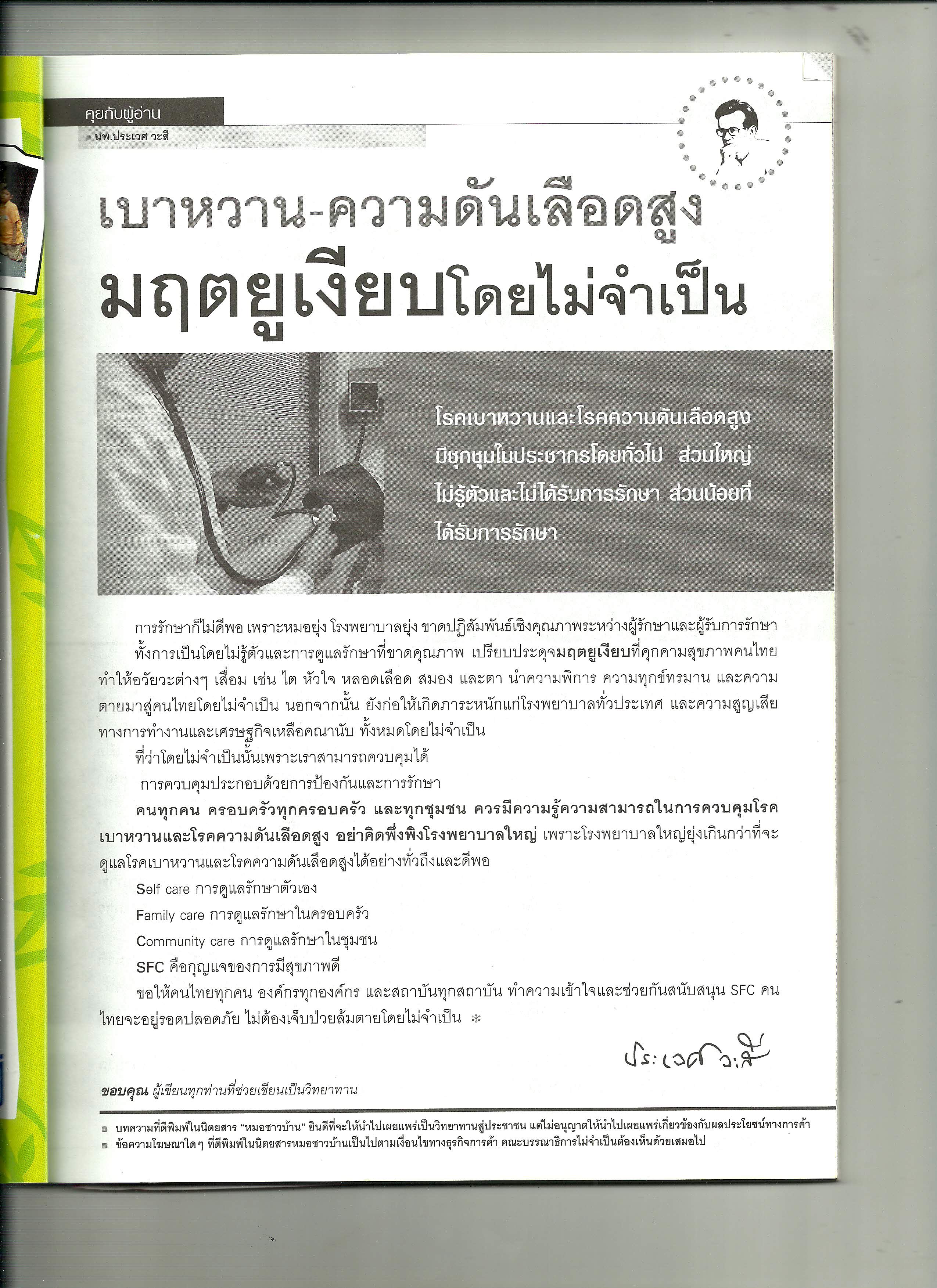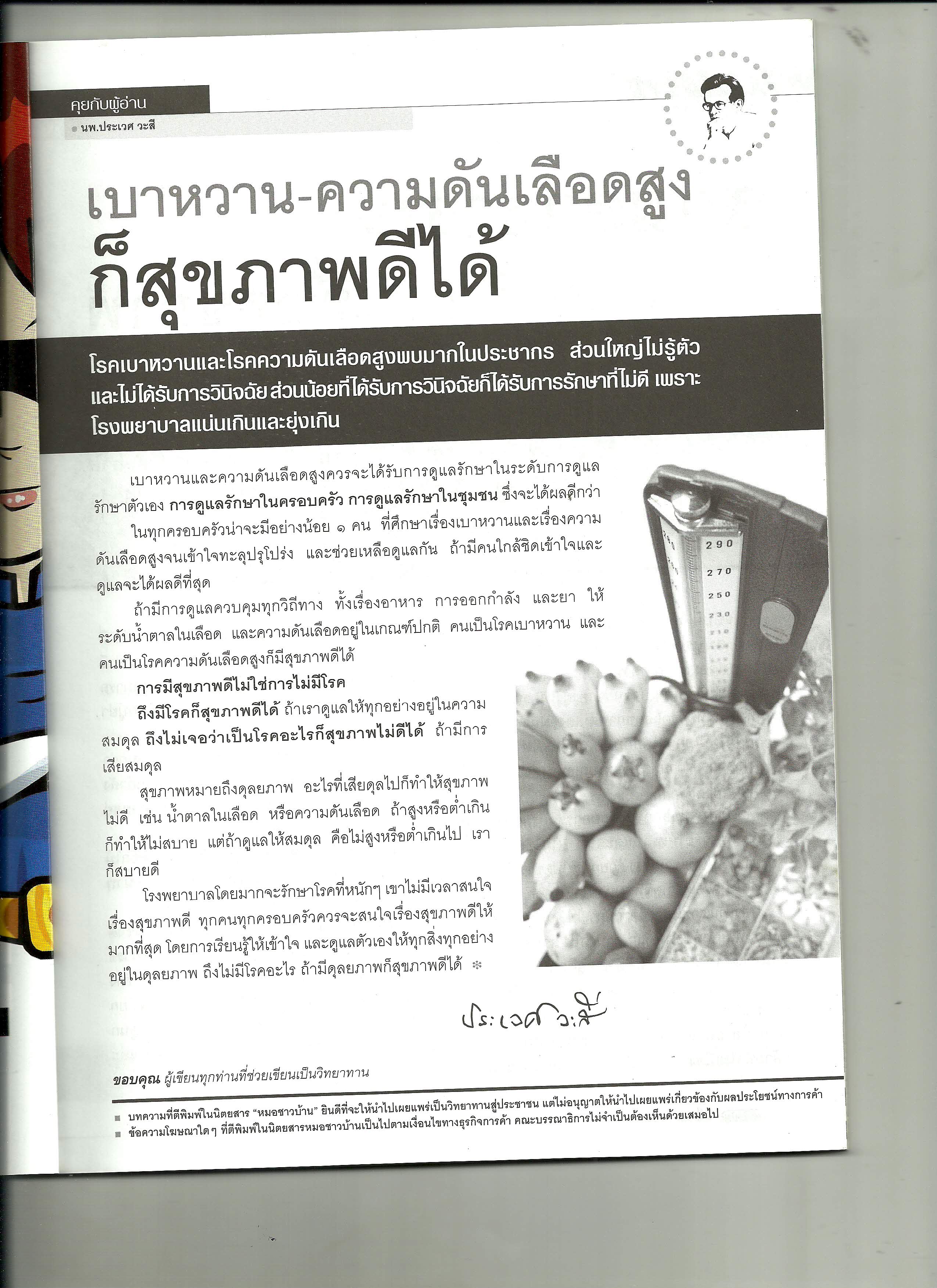คุยกับผู้อ่านฉบับนี้ กล่าวถึง โรคเบาหวานและโรคความดันเลือดสูง มีชุกชุมในประชากรโดยทั้วไป ส่วนใหญ่ไม่รู้ตัวและไม่ได้รับการรักษา ส่วนน้อยได้รับการรักษา ฉะนั้นคนทุกคน ครอบครัวทุกครอบครัว และทุกชุมชน ควรมีความรู้ความสามารถในการควบคุมโรคเบาหวานและโรคความดันเลือดสูง เพราะจะทำให้อยู่รอดปลอดภัย ไม่เจ็บป่วยล้มตายโดยไม่จำเป็น -