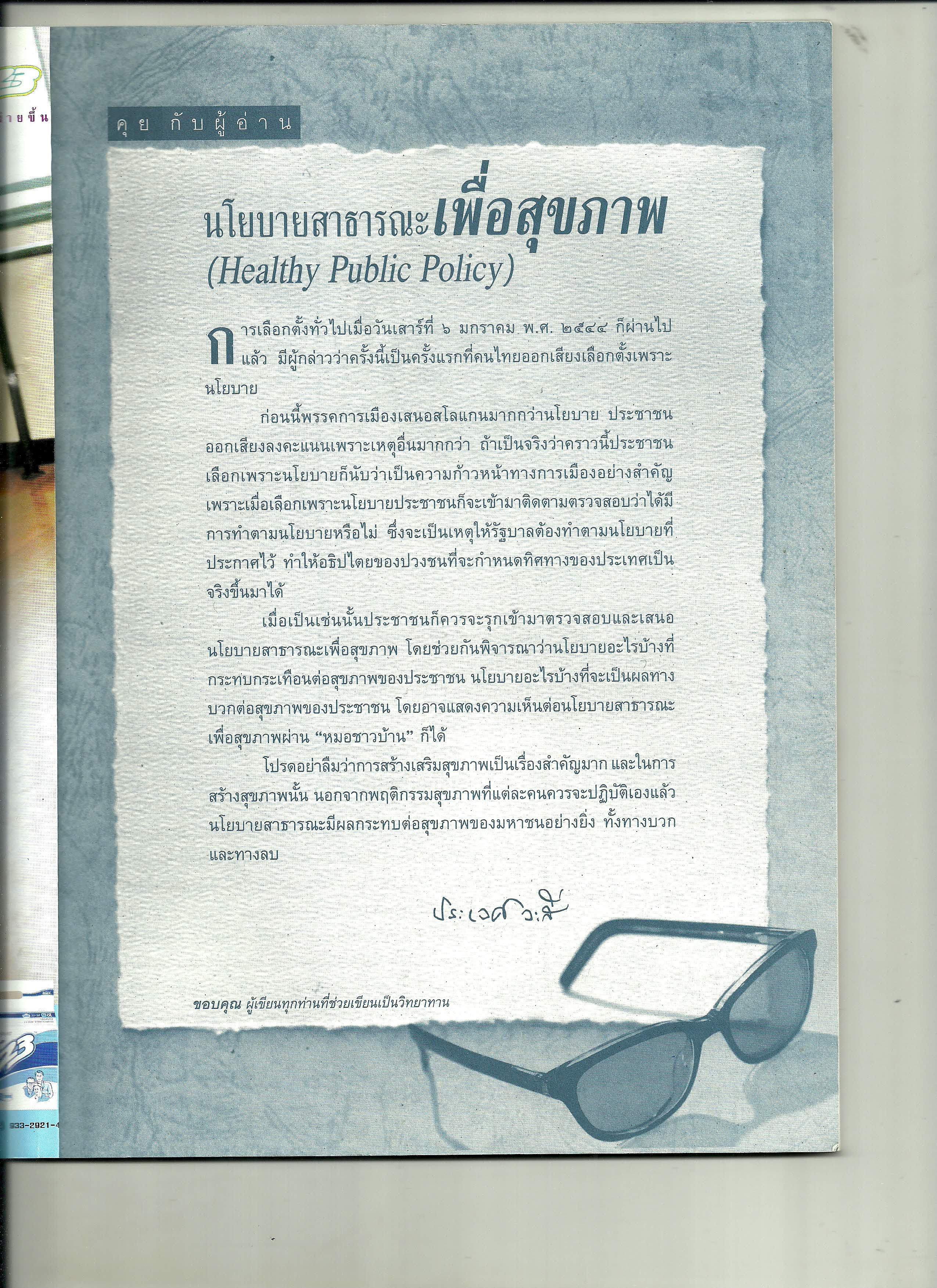 คุยกับผู้อ่าน : นโยบายสาธารณะเพื่อสุขภาพ (Healthy public policy) (นิตยสารหมอชาวบ้าน ฉบับที่ 262 เดือนกุมภาพันธ์ พ.ศ. 2544)