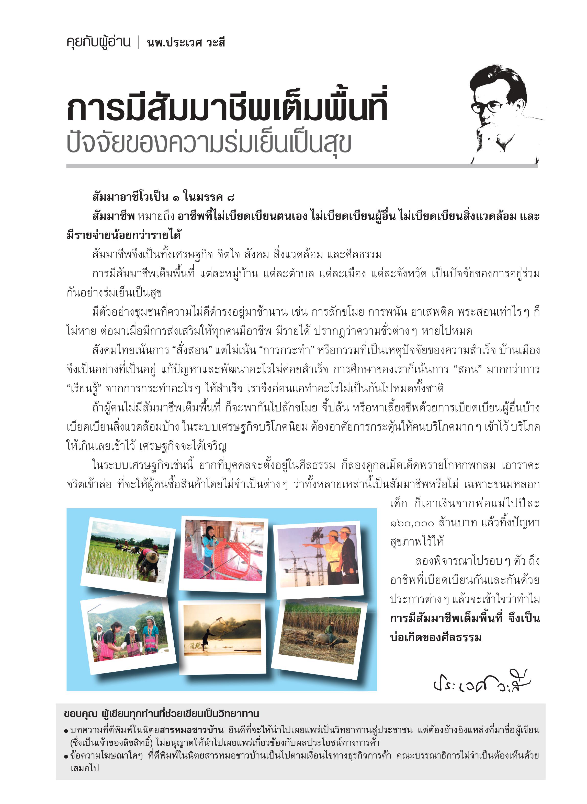 คุยกับผู้อ่าน : การมีสัมมาชีพเต็มพื้นที่ปัจจัยของความร่มเย็นเป็นสุข (นิตยสารหมอชาวบ้าน พ.ศ.2557 )