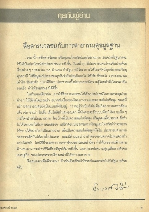คุยกับผู้อ่าน : สื่อสารมวลชนกับการสาธารณสุขมูลฐาน (นิตยสารหมอชาวบ้าน ฉบับที่ 73 เดือนพฤษภาคม พ.ศ. 2528)
