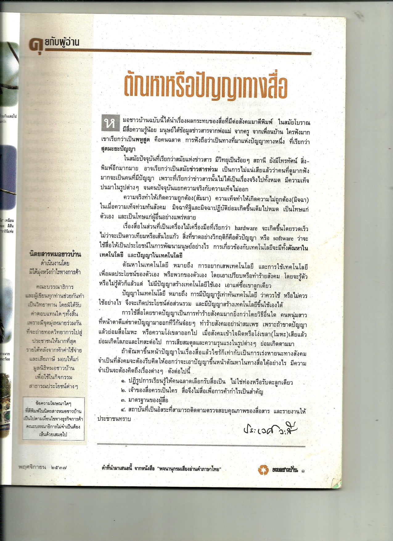 คุยกับผู้อ่าน : ตัณหาหรือปัญญาทางสื่อ (นิตยสารหมอชาวบ้าน ฉบับที่ 187 เดือนพฤศจิกายน พ.ศ. 2537)