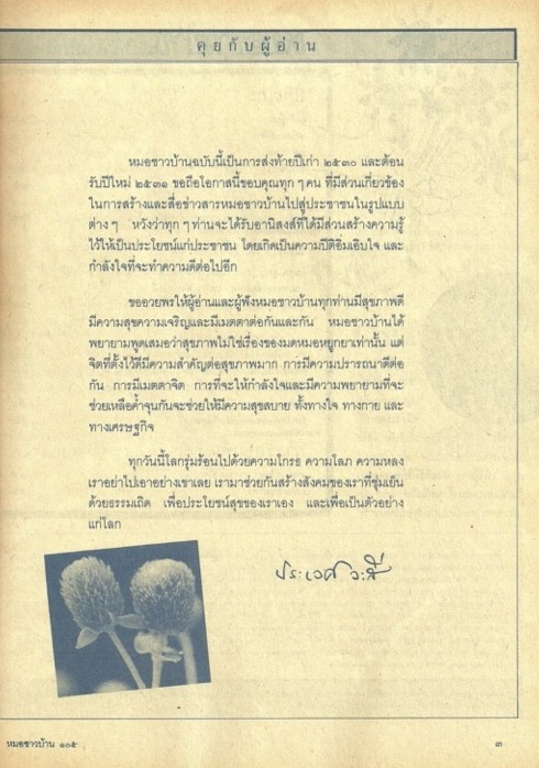 เนื้อหาในเอกสารกล่าวถึงการส่งท้ายปีเก่า 2530 และสวัสดีปีใหม่ 2531 แก่ผู้อ่าน ผู้เขียนกล่าวถึงความสำคัญของการมีเมตตากรุณาต่อกันที่เป็นสิ่งสำคัญที่ช่วยพัฒนาสุขภาพกาย สุขภาพใจและสุขภาพจิต เป็นรากฐานสำคัญของการพัฒนาตนเองและสังคม -