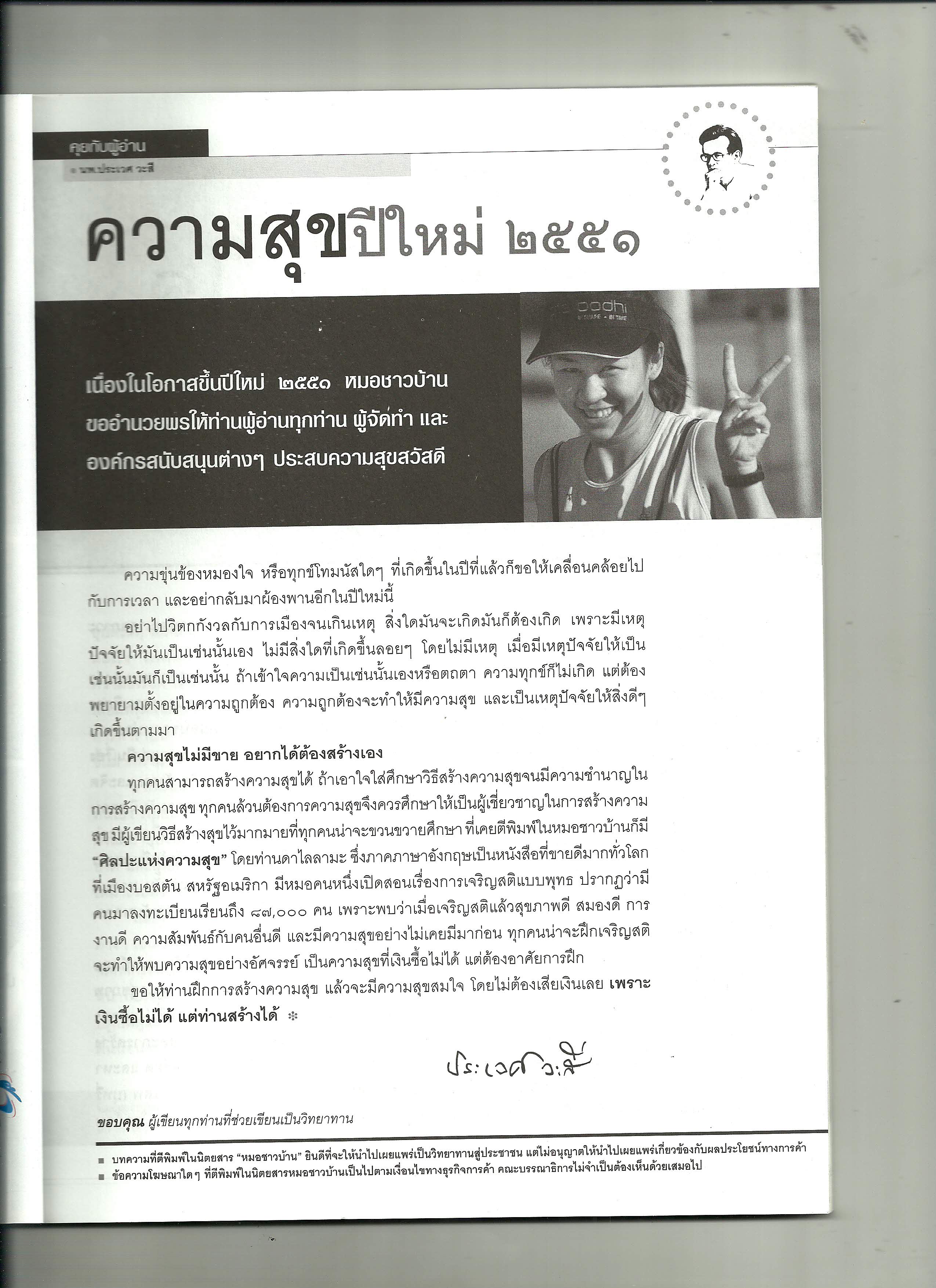 ศ.นพ.ประเวศ วะสี ได้ เขียนบทความ ความสุขปีใหม่ 2553 ในนิตยสาร หมอชาวบ้าน คอลัมน์คุยกับผู้อ่าน โดย ศ.นพ.ประเวศ วะสี ได้เขียนทักทายผู้อ่านเนื่องในโอกาสวันขึ้นปีใหม่ 2553 -