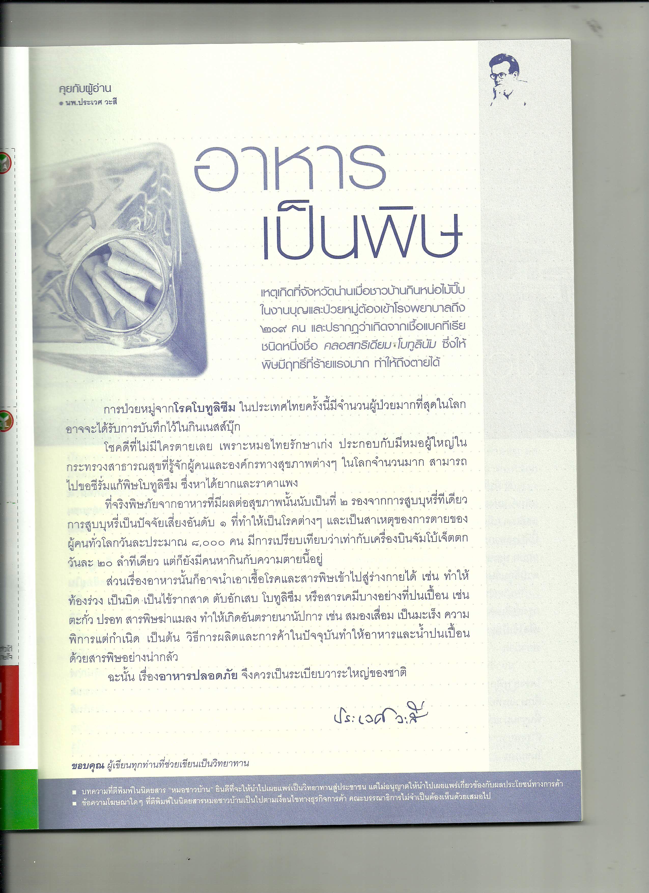 บทบรรณาธิการในนิตยสารหมอชาวบ้าน ฉบับที่ 325 เดือนพฤษภาคม 2549 ซึ่งเขียนโดย ศ.นพ.ประเวศ วะสี อธิบายเกี่ยวกับการป่วยเป็นโรคโบทูลิซึมในประเทศไทย ซึ่งมีสาเหตุมาจากอาหารเป็นพิษ และช่วงท้ายได้กล่าวถึงเรื่องอาหารปลอดภับ ควรเป็นระเบียบวาระใหญ่ของชาติ