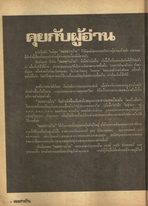 เนื้อหาในเอกสารปรากฏรายชื่อของคณะที่ปรึกษาและกล่าวถึงพระมหากรุณาธิคุณของสมเด็จพระนางเจ้าพระบรมราชินีนาถที่มีต่อนิตยสารหมอชาวบ้าน นอกจากนี้ นิตยสารยังได้รับการสนับสนุนจากสถาบันสุขภาพสาธารณสุขอเมริกัน กระทรวงสาธารณสุขและองค์การอนามัยโลกที่มอบนิตยสารให้ อ.ส.ม. ผู้เขียนกล่าวถึงปณิธานในการจัดทำนิตยสารว่าต้องการเผยแพร่ให้ถึงประชาชนทุกคน และกล่าวถึงความสำคัญของภูมิปัญญาการรักษาแบบพื้นบ้านหรือแบบไทยที่จะช่วยทำให้ประชาชนชาวไทยและประเทศไทยสามารถพึ่งพาตนเองได้มากขึ้น -