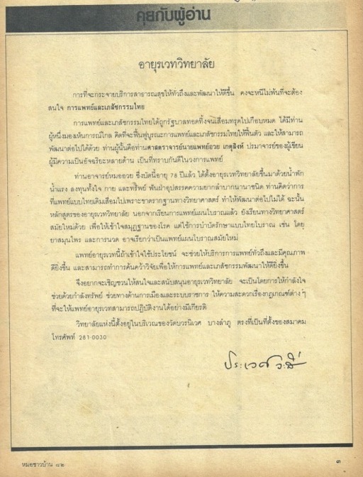 คุยกับผู้อ่าน : อายุรเวทวิทยาลัย (นิตยสารหมอชาวบ้าน ฉบับที่ 82 เดือนกุมภาพันธ์ พ.ศ. 2529)