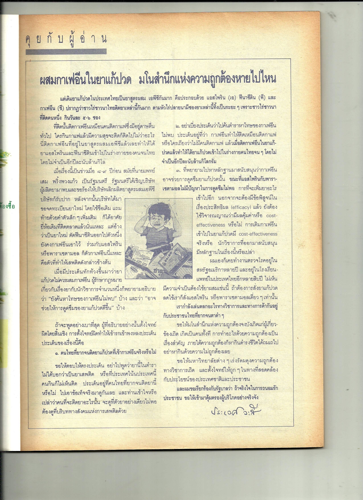 คุยกับผู้อ่าน : ผสมกาเฟอีนในยาแก้ปวด มโนสำนึกแห่งความถูกต้องหายไปไหน (นิตยสารหมอชาวบ้าน ฉบับที่ 143 เดือนมีนาคม พ.ศ. 2534)